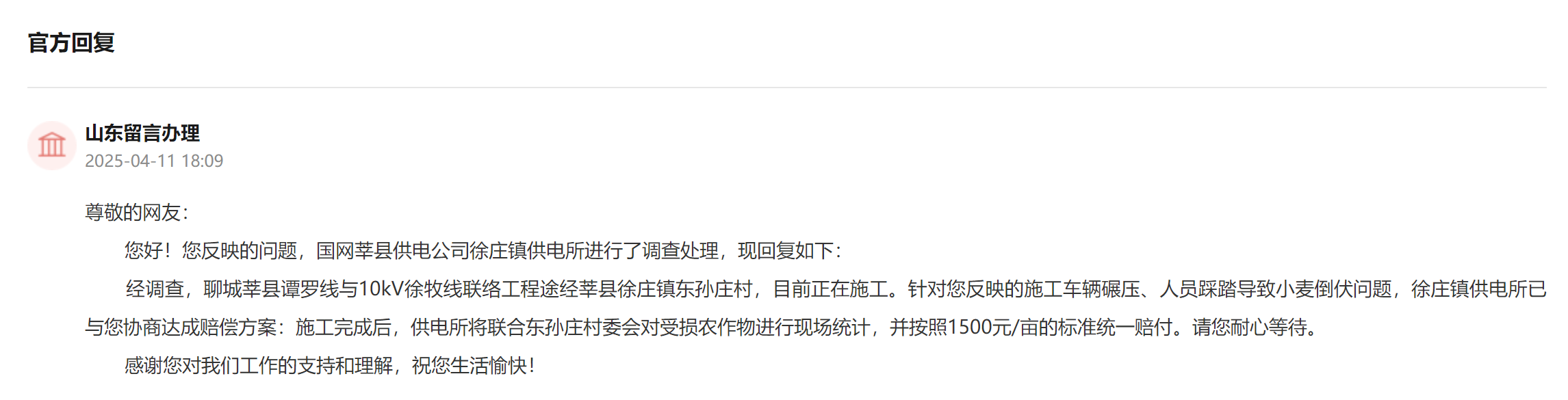 经查询拜访,聊城莘县谭罗线kV徐牧线联络工程路过莘县徐庄镇东孙庄村,目前正正在施工。针对网友反映的施工车辆碾压、人员踩踏导致小麦倒伏问题,徐庄镇供电所施工完成后,将结合东孙庄村委会对受损农做物进行现场统计,并按照1500元/亩的尺度同一赔付。