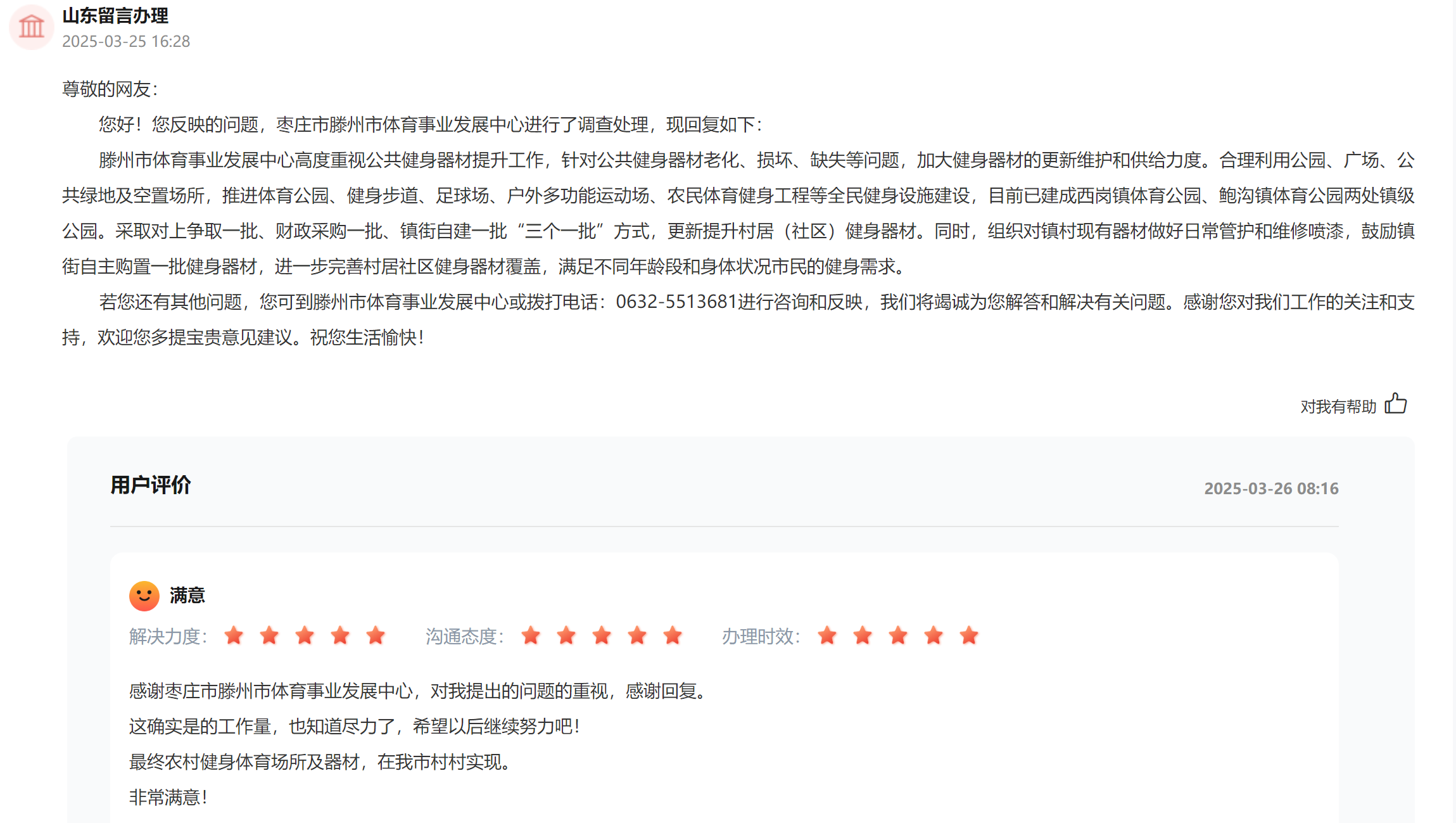 “感激枣庄市滕州市体育事业成长核心,对我提出问题的注沉,感激答复!”枣庄市一位网友兴奋地暗示,“最终农村健身体育场合及器材,正在我市村村实现。很是对劲!”本来,这位网友正在“带领留言板”留言,和枣庄市可以或许列出规划,争取三年时间,枣庄市全数实现天然村,村村有体育健身器材和固定的体育健身场合。